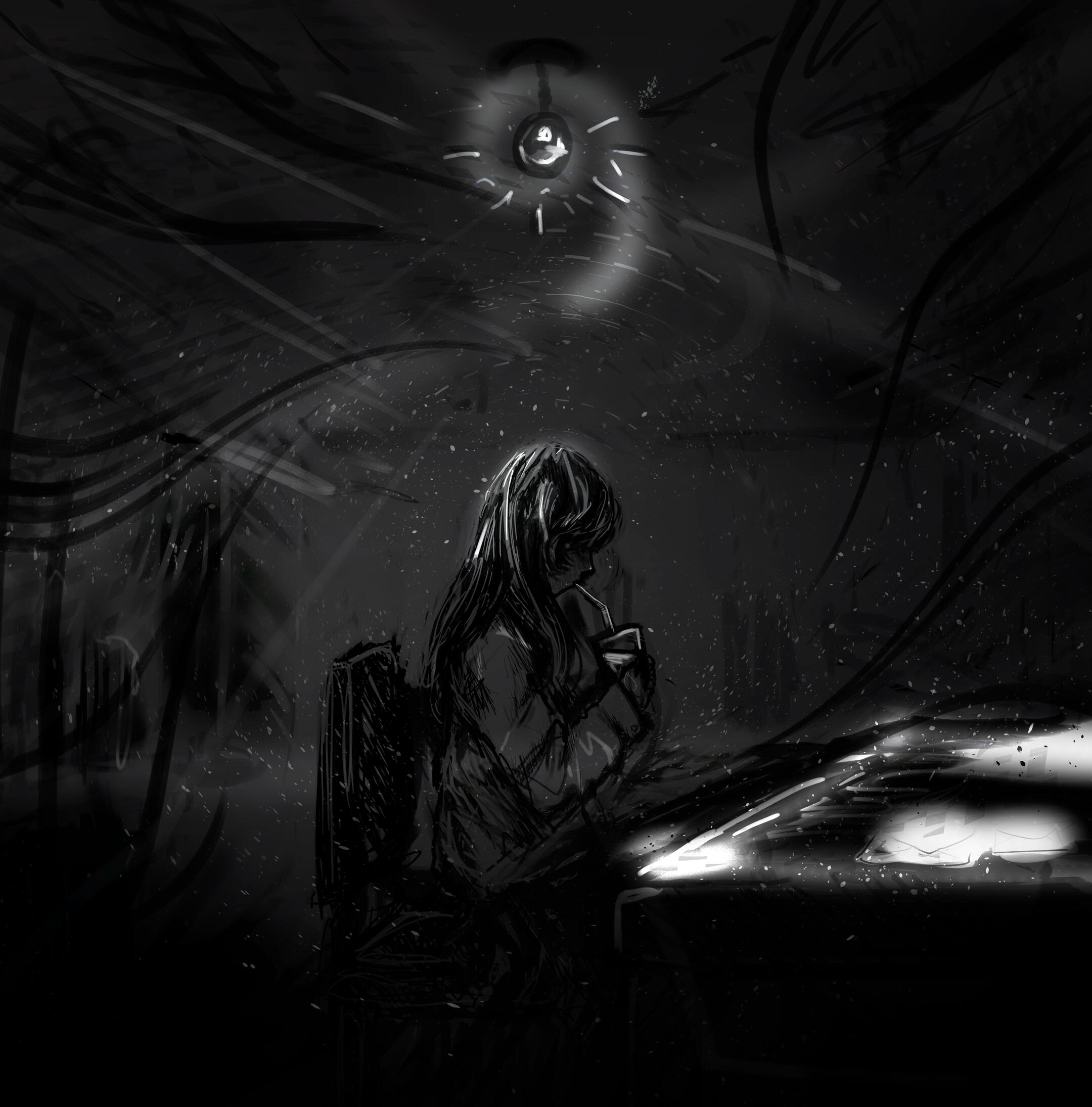 The train ride home was quiet.Streaks of orange and blue passing through the window, the city smearing past her.Sanae watched it all disappear, shoulder resting against the glass."..."Her reflection floated, cut through by passing lights.For a while that was enough. A quiet resting place to gather her thoughts....“Next stop, Asahine Station...” — the rest of the announcement blurred beneath the noise of the rails. The train rumbled softly before it slowed — brakes hissing, the sound pulling her back. She blinked."Don't forget any belongings..."A sigh left her as she rose, picking up her bag as the door opened....The platform was empty—mostly.Sanae sat on a bench. Waiting. Neon lights buzzing overhead. Thoughts drifting back to the place she'd just left.She’d moved slowly, absorbed everything. Some pieces had held her gaze.Some she even liked — or thought she did.Did I really not draw anything?The thought slipped in uninvited, quiet and stubborn. Her brow knitted.She glanced up at the station screen. Squinting, trying to catch the numbers, as if meaning might appear if she stared long enough. Her foot started tapping before she noticed.Five minutes, huh?Something about it pushed more than it should have.A sigh escaped her, her body tilting forward.A thought.That large abstract piece again —She’d thought it moved her.Maybe it didn’t.The thought stayed there, thin and dry. An uncertainty that wouldn’t settle —her thoughts hanging like dust caught in daylight."Asahine - Direction, Otohama"The station voice crackled through the air.Finally..